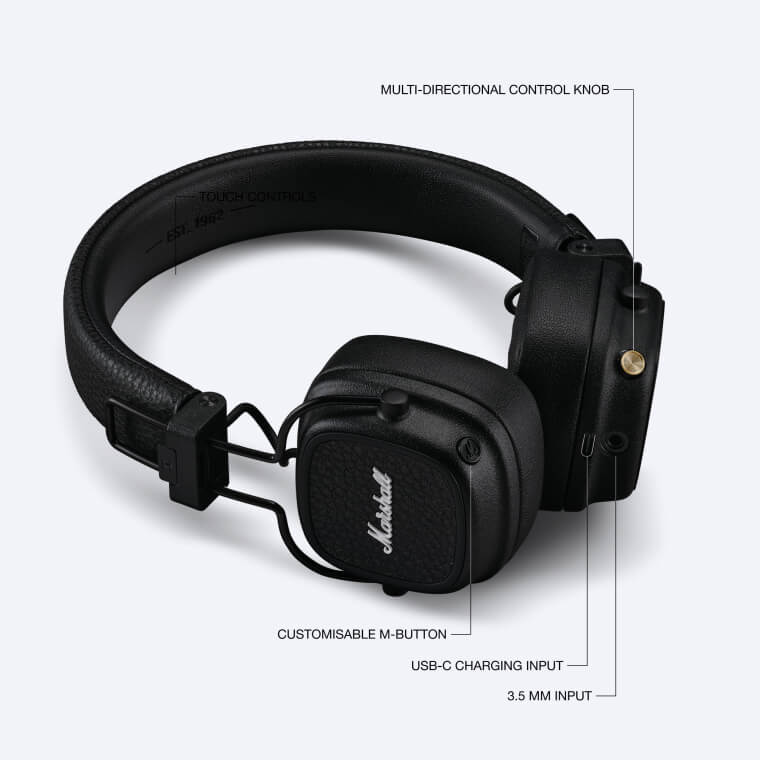 Instantly access the Spotify Tap default function or your EQ settings or voice assistant thanks to Major V's M-button and the Marshall Bluetooth app.